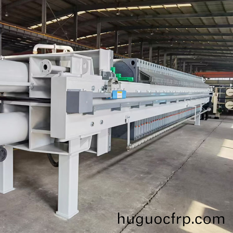 工作前将滤布套在滤板上,然后操作压滤机,驱动压紧杆,将压紧板紧地压紧滤板。启动进料泵将物料通过进料口输入压滤机,物料通过滤板上的通道进入滤室,在进料泵压力的作用下,清液透过滤布进入滤板上密布的圆点式滤面。再通过滤板上的通到进入出液口汇集后由出液口流出。而滤饼被截留在滤室中,直至滤饼充满滤室,然后停止进料泵,松开压紧板,再将滤板一块一块地拉往压紧板方向卸掉框中的滤饼,再重新进入下一个工作循环。