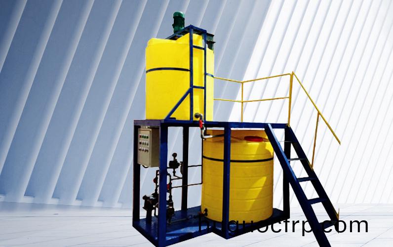 该装置是在JDY型溶药搅拌装置下部增加一个较大容积的储药罐组成,JDY型溶药搅拌装置制备完成溶液以自流方式进入储液罐,然后再进行新的药液的制备,从而保证药液的连续供应。